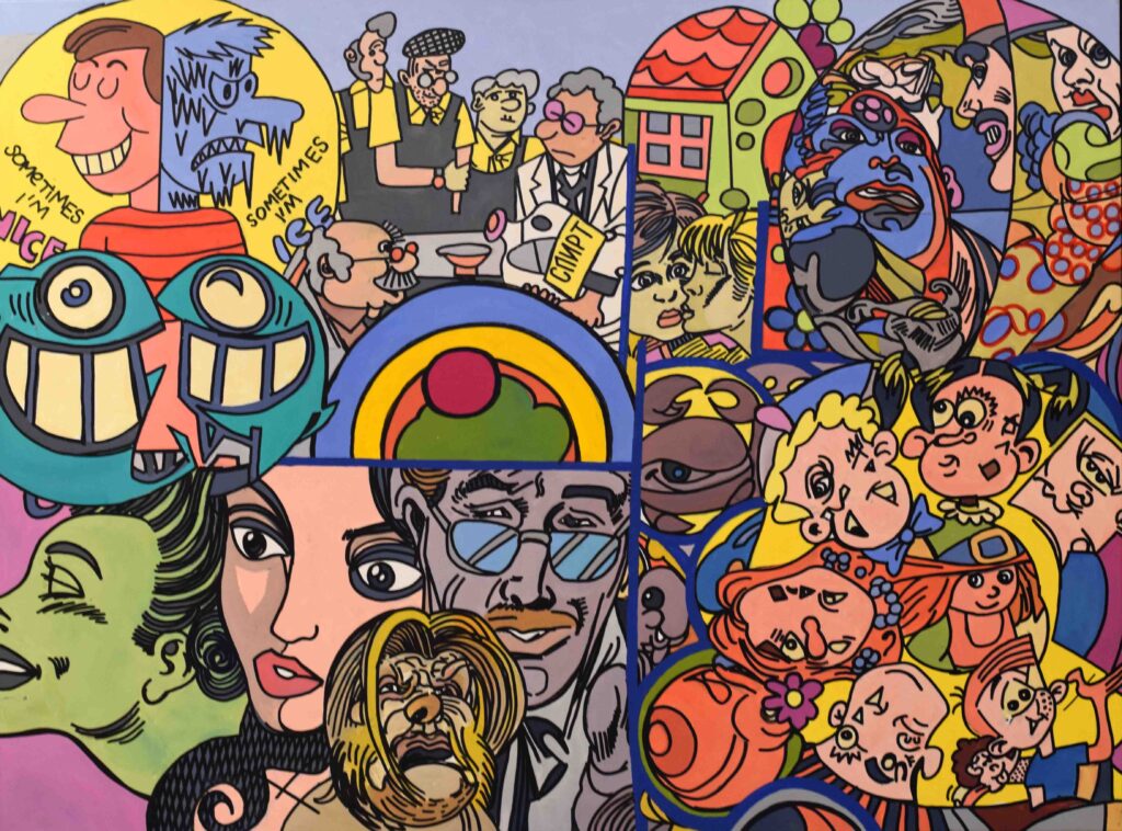 Chaque toile d’Erró est un choc visuel. L’artiste y rassemble des images issues de la publicité, des bandes dessinées, de la propagande, du cinéma ou encore de l’histoire de l’art. Il ne les organise pas selon une hiérarchie classique, mais les entasse, les entrechoque. Cette saturation visuelle crée un effet de vertige. Le regard est happé, sans point de fuite stable.