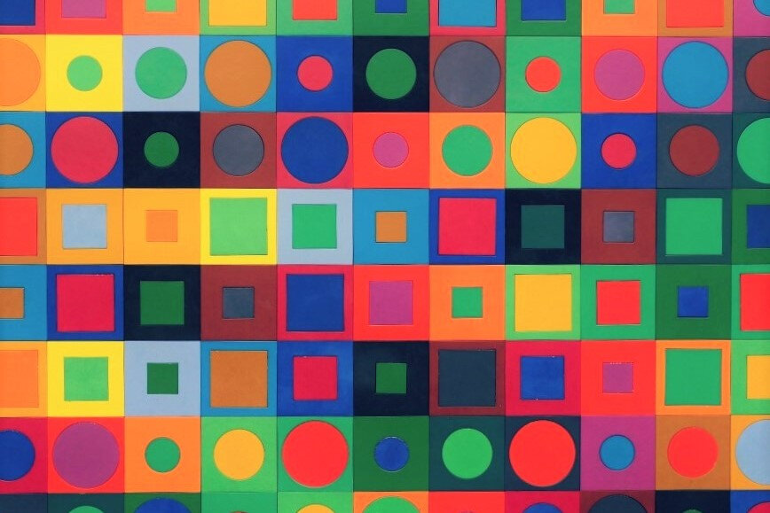 Dans les années 1960, Vasarely formalise son concept d’« alphabet plastique ». Il s’agit d’un répertoire de formes géométriques simples (carrés, cercles, losanges) associés à des couleurs pures. Ces modules, combinés à l’infini, créent une sorte de langue visuelle.
